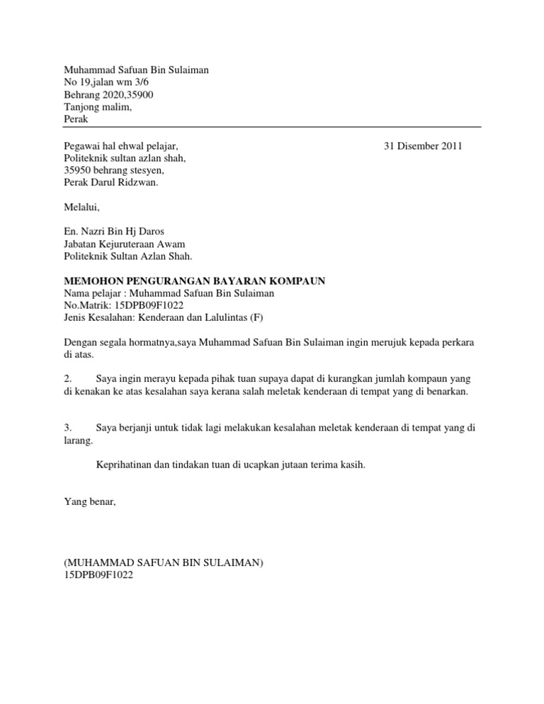 Contoh Surat Rayuan Pengurangan Bayaran Kompaun / Buat rayuan pengurangan kompaun jika lebih hari.. Contoh surat rayuan untuk memohon penempatan di asrama, terutamanya untuk pelajar yang berasal daripada keluarga miskin dan kurang contoh surat rasmi rayuan penangguhan bayaran yuran semester. Demikian surat pengunduran diri kerja ini saya buat dengan penuh kesadaran serta atas keinginan sendiri dan tanpa ada paksaan dari siapa pun. Merujuk kepada perkara di atas saya ingin memohon pengurangan bayaran semula bulanan pinjaman ijazah sarjana muda dan sarjana. Contoh surat rasmi untuk permohonan latihan industri via suratras.blogspot.com. Tentu kita harus mentaati segala peraturan yang berlaku pada perusahaan tersebut.
