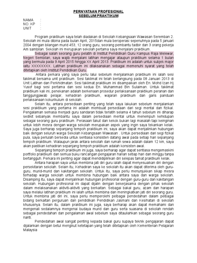 Pernyataan Profesional Semasa Praktikum / Setelah tujuh minggu menjalani latihan praktikum, masih banyak perkara yang perlu saya perbaiki terutamanya dari aspek penulisan rancangan pengajaran harian.. Uji kecepatan katalisis h2o2, uji pengaruh suhu, dan uji pengaruh ph terhadap aktifitas enzim katalase. Surat pernyataan adalah pernyataan seseorang terhadap adanya suatu hal. Ini juga memberi peluang kepada guru pelatih untuk mengamalkan segala pengetahuan dan kemahiran yang dipelajari semasa di institut pendidikan guru (ipg) serta. Pernyataan profesional harapan untuk internship sebelum praktikum. 2.2 membentuk permuafakatan dan perkongsian pintar.