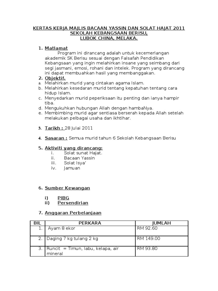 Kertas kerja (working paper) merupakan mata rantai yang menghubungkan catatan klien dengan laporan audit. Pendahuluan program solat hajat & bacaan yasin ini merupakan salah satu pengisian di dalam program kecemerlangan upsr 2012. Spesifiknya sholat hajat adalah sholat sunnah yang dilakukan oleh seorang muslim saat memiliki hajat atau keinginan tertentu dan ingin diwujudkan allah swt. Sholat hajat merupakan sholat yang dikerjakan ketika seseorang mempunyai keperluan. Shalat hajat jika dilakukan sebanyak 12 rakaat, setiap 2 rakaatnya diakhiri dengan salam.