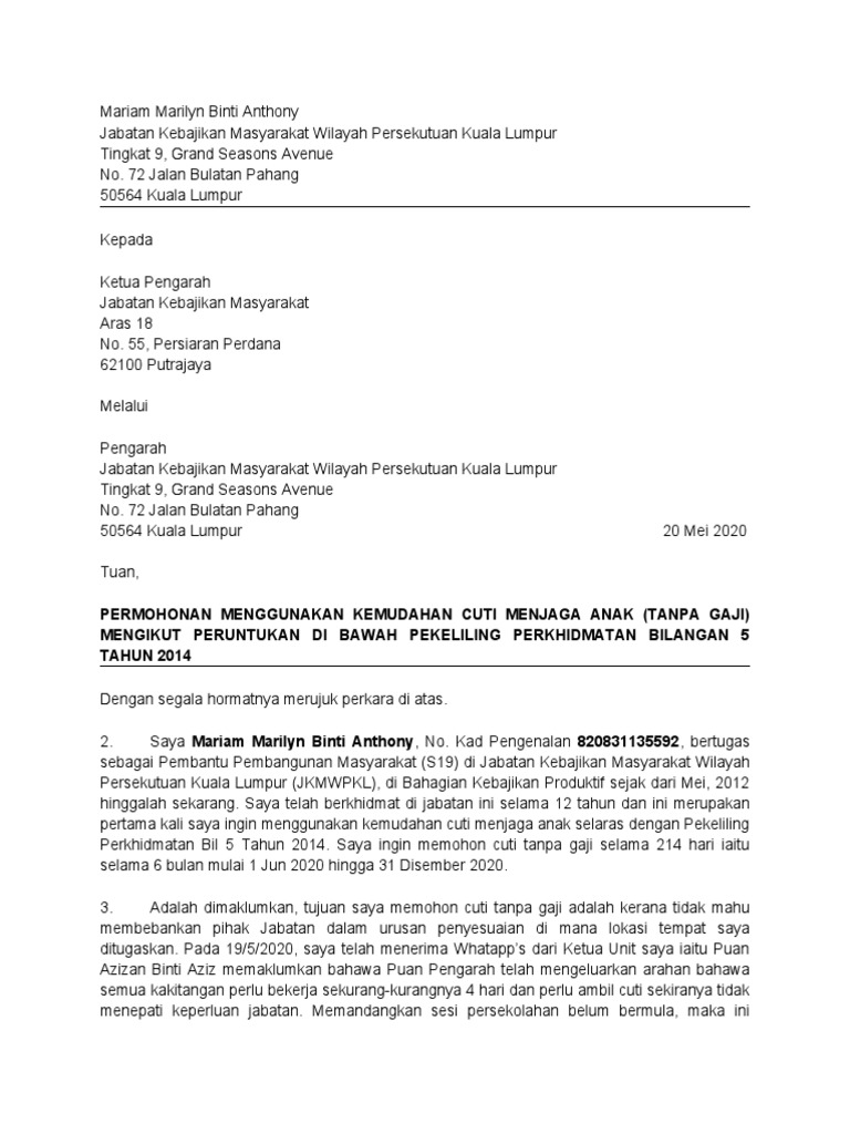For more information and source, see on this link : Pekeliling perkhidmatan umt bilangan 2 tahun 2014 imbuhan tahunan dan bayaran khas prestasi tahun 2014 tujuan 1. (mengikut skim perkhidmatan, sekiranya sedang memangku, sila nyatakan gred pemangkuan) 4. Permohonan kemudahan cuti menjaga anak (cma) di bawah pekeliling perkhidmatan bilangan 5 tahun 2014. Pekeliling perkhidmatan bilangan 6 tahun 2014. (di bawah pekeliling perkhidmatan bilangan 5 tahun 2014) arahan : (pekeliling perkhidmatan bilangan 5 tahun 2014) perhatian : 3 tahun 2014 pelaksanaan kumpulan wang amanah pembangunan projek ict sektor awam (kwaict) Borang permohonan cuti menjaga anak yang bersambung dengan cuti bersalin hendaklah dikemukakan kepada jabatan pendaftar 30 hari sebelum tamat tempoh cuti bersalin; Jawatan dan gred hakiki (mengikut skim perkhidmatan. Kerajaan malaysia pekeliling perkhidmatan bilangan 5 tahun 2013 pemberian pemindahan gaji kepada pegawai perkhidmatan awam persekutuan di bawah sistem saraan malaysia tujuan 1. Arahan perbendaharaan dan spp lain 1 perancangan perolehan 3. Pelaksanaan waktu bekerja fleksi (wbf) di agensi kerajaan persekutuan created date: